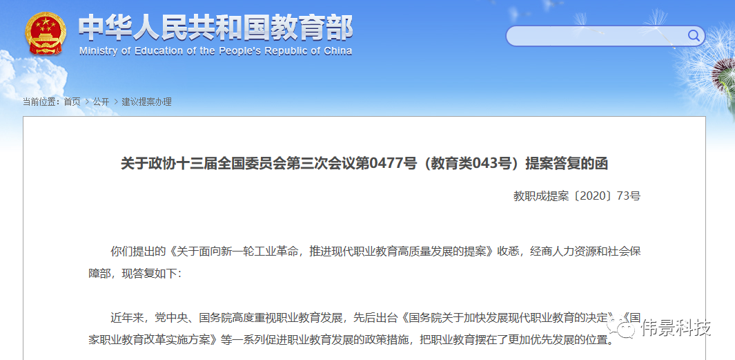 教育部:加快《職業(yè)教育法》修訂步伐,深化職業(yè)教育改革發(fā)表時間:2020-11-02 17:53 教育部:加快《職業(yè)教育法》修訂步伐,深化職業(yè)教育改革近日,教育部公布對政協(xié)十三屆全國委員會第三次會議第0477號(教育類043號)提案,《關于面向新一輪工業(yè)革命,推進現(xiàn)代職業(yè)教育高質(zhì)量發(fā)展的提案》答復中稱,近年來,黨中央、國務院高度重視職業(yè)教育發(fā)展,先后出臺《國務院關于加快發(fā)展現(xiàn)代職業(yè)教育的決定》《國家職業(yè)教育改革實施方案》等一系列促進職業(yè)教育發(fā)展的政策措施,把職業(yè)教育擺在了更加優(yōu)先發(fā)展的位置。下一步,教育部將貫徹落實全國教育大會精神,落實國務院《國家職業(yè)教育改革實施方案》的有關部署,更好發(fā)揮國務院職業(yè)教育工作部級聯(lián)席會議辦公室作用,深化職業(yè)教育改革。 ![]() 你們提出的《關于面向新一輪工業(yè)革命,推進現(xiàn)代職業(yè)教育高質(zhì)量發(fā)展的提案》收悉,經(jīng)商人力資源和社會保障部,現(xiàn)答復如下: 近年來,黨中央、國務院高度重視職業(yè)教育發(fā)展,先后出臺《國務院關于加快發(fā)展現(xiàn)代職業(yè)教育的決定》《國家職業(yè)教育改革實施方案》等一系列促進職業(yè)教育發(fā)展的政策措施,把職業(yè)教育擺在了更加優(yōu)先發(fā)展的位置。 一、關于職業(yè)教育的配套制度建設 一是提高技術技能人才待遇和地位。2018年3月,中共中央辦公廳、國務院辦公廳印發(fā)《關于提高技術工人待遇的意見》提出完善技術工人培養(yǎng)、評價、使用、激勵、保障等措施,全國已有30個省(市、區(qū))出臺了貫徹落實文件的實施意見或相關政策。目前,人力資源和社會保障部正在研究制定《技能人才薪酬分配指引》,引導企業(yè)加大對技能要素參與分配的激勵力度,鼓勵試行高技能領軍人才年薪制。2019年1月,國務院印發(fā)《國家職業(yè)教育改革實施方案》,明確提出支持技術技能人才憑技能提升待遇,鼓勵企業(yè)職務職級晉升和工資分配向關鍵崗位、生產(chǎn)一線崗位和緊缺急需的高層次、高技能人才傾斜;積極推動職業(yè)院校畢業(yè)生在落戶、就業(yè)、參加機關事業(yè)單位招聘、職稱評審、職級晉升等方面與高校畢業(yè)生享受同等待遇。 二是建立職業(yè)教育質(zhì)量認證和評估制度。教育部分別從2012年和2016年起,組織高職和中職學校編制、報送質(zhì)量年度報告,并由全國高職高專校長聯(lián)席會議委托上海市教育科學研究院和麥可思公司發(fā)布國家職業(yè)教育質(zhì)量年報,基本形成國家、省、學校三級質(zhì)量年報制度,受到社會各界關注;此外,聯(lián)合相關部門和行業(yè)企業(yè)建立56個行業(yè)職業(yè)教育教學指導委員會,指導委員會發(fā)布近60個行業(yè)人才需求預測與專業(yè)設置指導報告和13個行業(yè)職業(yè)教育年報。 三是鼓勵支持社會力量參與職業(yè)教育辦學。2016年第十二屆全國人民代表大會常務委員會第二十四次會議第二次修正的《中華人民共和國民辦教育促進法》明確規(guī)定,民辦學校與公辦學校具有同等法律地位。例如在獎助學金政策方面,2019年6月,財政部、教育部印發(fā)《關于調(diào)整職業(yè)院校獎助學金政策的通知》,明確“對包括公辦、民辦在內(nèi)的各類職業(yè)院校一視同仁,確保民辦職業(yè)院校按規(guī)定享受同等政策”。2018年,教育部等六部門印發(fā)《職業(yè)學校校企合作促進辦法》,鼓勵有條件的企業(yè)舉辦或者參與舉辦職業(yè)學校。2019年,教育部面向社會公開《中華人民共和國職業(yè)教育法修訂草案(征求意見稿)》,明確國家鼓勵發(fā)展多層次的職業(yè)教育,推進多元辦學,發(fā)揮企業(yè)重要辦學主體作用,支持社會各種主體廣泛參與職業(yè)教育。 二、暢通技術技能人才成長通道 一是建立職業(yè)教育資歷框架體系。近年來,教育部按照中央決策部署,以中高職銜接為切入點,重點改革學制、課程銜接體系和升學考試制度,為技術技能人才繼續(xù)學習和職業(yè)生涯發(fā)展奠定基礎。2019年,教育部啟動實施本科層次職業(yè)教育試點工作,分批次遴選建設了22所職業(yè)教育本科試點學校,為職業(yè)教育人才培養(yǎng)體系向上延伸探索路徑。委托教育部職業(yè)教育研究所和國家開放大學分別開展國家資歷框架和學分銀行信息平臺建設, 學分銀行信息平臺同步建立機構(gòu)賬戶3863家,個人學習賬戶195142個。 二是完善職業(yè)教育考試招生方式。2019年,教育部印發(fā)《關于做好2019年高職擴招專項考試招生工作的通知》(教學廳〔2019〕6號),繼續(xù)完善“文化素質(zhì)+職業(yè)技能”的評價方式和選拔機制,針對不同群體的特點和受教育狀況,采取分列招生計劃、分類考試評價、分別選拔錄取。其中,對于退役軍人、下崗失業(yè)人員、農(nóng)民工和新型職業(yè)農(nóng)民,可免予文化素質(zhì)考試,由各校根據(jù)學校基本培養(yǎng)要求組織與報考專業(yè)相關的職業(yè)適應性測試或職業(yè)技能測試,依據(jù)測試成績錄?。粚τ诜厦庠嚄l件的技能拔尖人才,由高職院校予以免試錄取。 三是構(gòu)建職業(yè)技能等級認證體系。2019年,教育部會同國家發(fā)展改革委有關部門印發(f