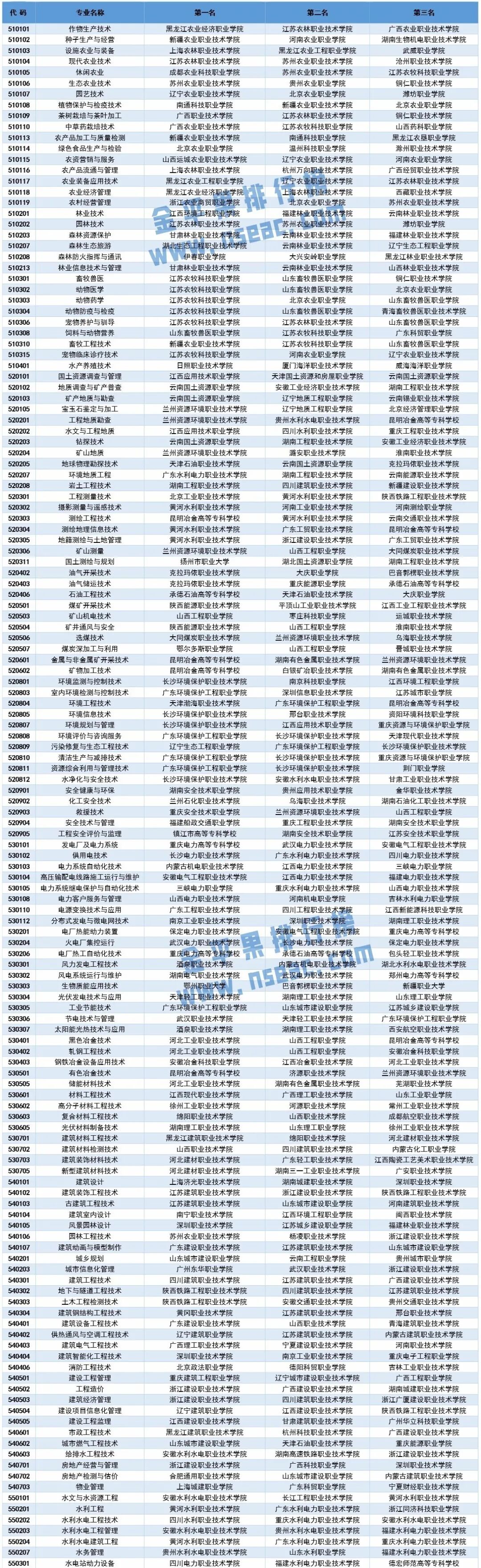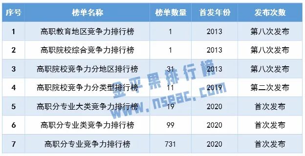 “金平果”首次發(fā)布高職專業(yè)評價結(jié)果發(fā)表時間:2020-05-09 16:34 高職專業(yè)總體實(shí)力江蘇、廣東、河南位列三甲 5月6日,“金平果”首次發(fā)布高職專業(yè)排行榜,包括全國1429所高職院校19個專業(yè)大類、99個專業(yè)類和731個??茖I(yè)的綜合實(shí)力分布情況,并對全國各地區(qū)、各高職院校的專業(yè)總體實(shí)力進(jìn)行了評價和分析。為助力“雙高”建設(shè),金平果對高職教育的評價進(jìn)入了新階段,已經(jīng)從單一的學(xué)校綜合評價向深層次、多維度的專業(yè)領(lǐng)域評價擴(kuò)展。 “金平果排行榜” (又稱“中評榜”)由杭州電子科技大學(xué)中國科教評價研究院、浙江高等教育研究院和高教強(qiáng)省發(fā)展戰(zhàn)略與評價研究中心、武漢大學(xué)中國科學(xué)評價研究中心聯(lián)合中國科教評價網(wǎng)(www.nseac.com)研發(fā),包括中國大學(xué)、世界大學(xué)、研究生教育和學(xué)術(shù)期刊四大評價報告。 由于今年是首次高職專業(yè)評價,指標(biāo)體系的確定經(jīng)過兩屆“全國高職院校建設(shè)與評價論壇”的研討、現(xiàn)場調(diào)查、咨詢專家意見、層次分析等復(fù)雜過程,考慮到了高職專業(yè)建設(shè)核心競爭力的方方面面,力求做到全面、客觀、公平、公正。 本次高職專業(yè)評價指標(biāo)體系分為三級,其中一級指標(biāo)包括師資隊(duì)伍、平臺基地、教學(xué)水平、科研產(chǎn)出和聲譽(yù)影響5個方面,二級指標(biāo)包括專任教師、教學(xué)團(tuán)隊(duì)、教研基地、人才培養(yǎng)、資源庫建設(shè)、學(xué)生競賽等15個方面,三級指標(biāo)包括教指委、行指委、萬人計(jì)劃、名師先進(jìn)、實(shí)訓(xùn)基地、教學(xué)成果、技能大賽、教學(xué)競賽、雙高建設(shè)、辦學(xué)歷史等32個方面,涉及60多個數(shù)據(jù)觀測點(diǎn)。 金平果2020高職院校專業(yè)評價結(jié)果采用得分、排名、等級與位次比相結(jié)合的表示方法,專業(yè)等級由5★、4★、3★、2★、1★組成,分別對應(yīng)于專業(yè)排名前5%、5-20%、20-50%、50-90%、90-100%的高職院校,專業(yè)大類、專業(yè)類與此類似。 專業(yè)大類是一個更為宏觀的概念,它可以幫助我們在更高層次上對國內(nèi)高職院校的專業(yè)教育競爭力有一個“量”和“質(zhì)”的總體把握。 表3給出了金平果2020中國高職院校分專業(yè)大類競爭力排行榜的前十名。 高職院校分專業(yè)類競爭力排行榜共有99個榜單,各專業(yè)類競爭力前三名院校名單見表4。 高職分專業(yè)競爭力排行榜共有731個榜單,由于篇幅較長,該榜單放在本文最后展示,此處先對今年的高職專業(yè)評價做一些總結(jié)分析。 哪些專業(yè)開設(shè)高校數(shù)最多?十大熱門專業(yè) 本次評價年度有招生的731個高職專業(yè)中,開設(shè)院校數(shù)較多的專業(yè)為會計(jì)、電子商務(wù)、物流管理等,開設(shè)高校數(shù)200以上的專業(yè)達(dá)53個,100以上112個,10所以下的專業(yè)269個, 5所以下156個,有35個專業(yè)只有1所高校開設(shè)。從表5可見開設(shè)高校數(shù)最多的十大熱門專業(yè),盡管開設(shè)學(xué)校數(shù)量很多,但仍沒有到頂跡象,和上年相比都成正增長。 哪些專業(yè)開設(shè)高校數(shù)增長最快?十大新興專業(yè) 我們對開設(shè)高校數(shù)10所以上的專業(yè)進(jìn)行統(tǒng)計(jì)發(fā)現(xiàn),汽車智能技術(shù)、家政服務(wù)與管理、大數(shù)據(jù)技術(shù)與應(yīng)用、老年保健與管理、幼兒發(fā)展與健康管理等專業(yè)的增長熱度較大,新開高校數(shù)成倍增加。 開設(shè)高校數(shù)的快速增長,從一定程度上反映了社會需求變化及今后發(fā)展方向,那么這些專業(yè)的競爭力哪些高校最強(qiáng)呢?通過幾十個指標(biāo)的綜合分析,“金平果”高職專業(yè)評價結(jié)果給出了每個專業(yè)的競爭力排名(見表9)。 高職專業(yè)總體水平地域分布:江蘇第一 我們按專業(yè)星級分別給予相應(yīng)得分(5★得5分…1★得1分),統(tǒng)計(jì)各地區(qū)和高校的總得分,分別列出各地區(qū)高職專業(yè)總體實(shí)力(見表7)和各高職院校專業(yè)整體實(shí)力分布狀況(見表8)。 從地區(qū)總得分來看,江蘇、廣東、河南、安徽、山東的高職專業(yè)總體水平居前五位,海南、寧夏、青海、西藏等地區(qū)得分差距較大。 高職專業(yè)整體水平學(xué)校分布:深職居首 從學(xué)??偟梅謥砜?,深圳職業(yè)技術(shù)學(xué)院、金華職業(yè)技術(shù)學(xué)院、蕪湖職業(yè)技術(shù)學(xué)院、武漢職業(yè)技術(shù)學(xué)院和廣東輕工職業(yè)技術(shù)學(xué)院進(jìn)入前五名。 當(dāng)然,地區(qū)和學(xué)校專業(yè)實(shí)力總得分和各地區(qū)高職院校數(shù)量、每所高校開設(shè)的專業(yè)數(shù)量、學(xué)校類型等數(shù)據(jù)有關(guān),專業(yè)總得分前50強(qiáng)高校中,理工類占28所、綜合18所,而財(cái)經(jīng)類3所、農(nóng)林類僅1所,可見理工、綜合類高校有規(guī)模優(yōu)勢,而專業(yè)數(shù)較少的醫(yī)學(xué)、藝術(shù)、體育等類高校得分較低,但是規(guī)模也是一種綜合實(shí)力的體現(xiàn)。 高職分專業(yè)競爭力排行榜 金平果2020高職院校專業(yè)評價包括1429所高職院校的731個??茖I(yè),在此